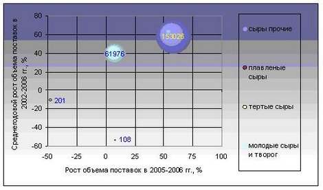 Импорт Республики Беларусь сыров и творога в 2002-2006 гг. характеризуется значительным увеличением темпов роста. Если в 2002-2006гг. ввоз рассматриваемой продукции рос в среднем за год на 48% в стоимостном выражении (на 43% — в физическом выражении), то в 2005-2006гг. — он увеличился на 124%.