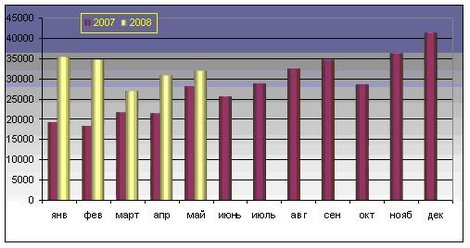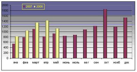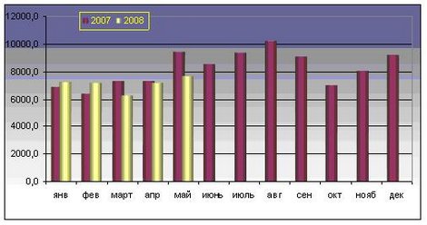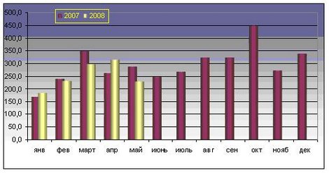Рис. 6. Динамика импорта Республики Беларусь в январе 2007 г. — мае 2008 г. сыров и творога, тыс. долл. США