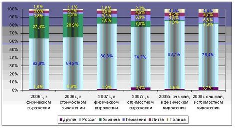 Высокие темпы роста характерны для импорта литовской продукции. Если в январе-мае 2007 г. поставки достигли объема 49,1 тонны на сумму 199,7 тыс. долл. США, то в январе-мае 2008 г. — 56,2 тонны на сумму 330,4 тыс. долл. США. В целом, в течение 2007 г. в Беларусь поставлено 134,7 тонны рассматриваемой продукции на сумму 626,2 тыс. долл. США.